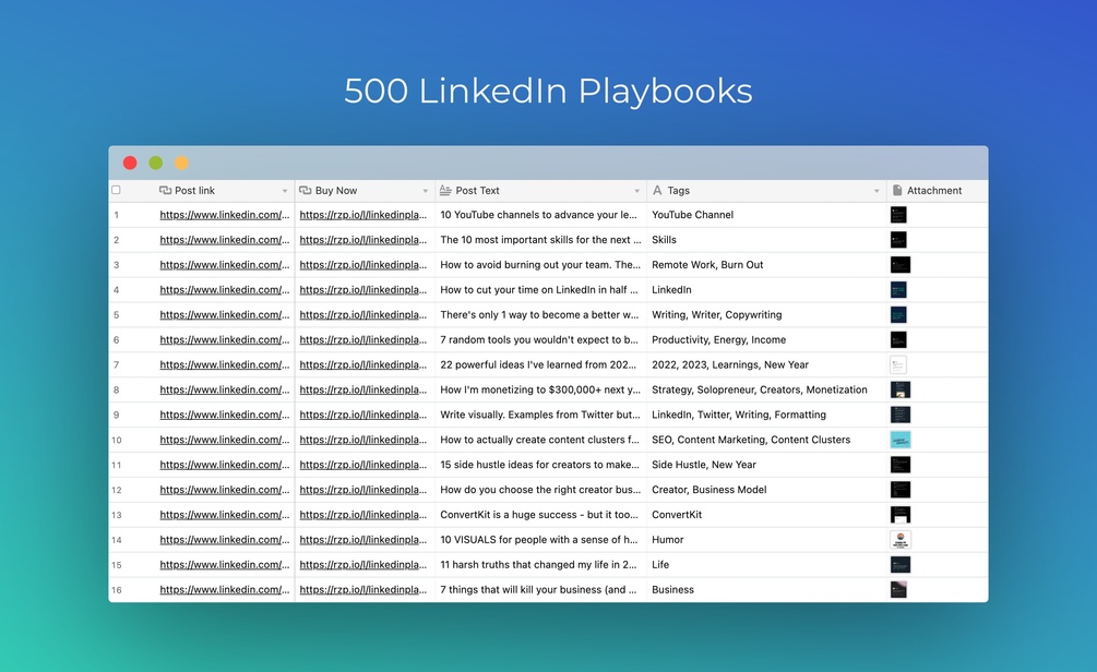 You will get the link & password on your email for accessing the airtable repository (both grid and gallery view). One can easily download & post the playbooks. If the user wish to give credits to the creator - we have mapped each post to the creator's LinkedIn profile.